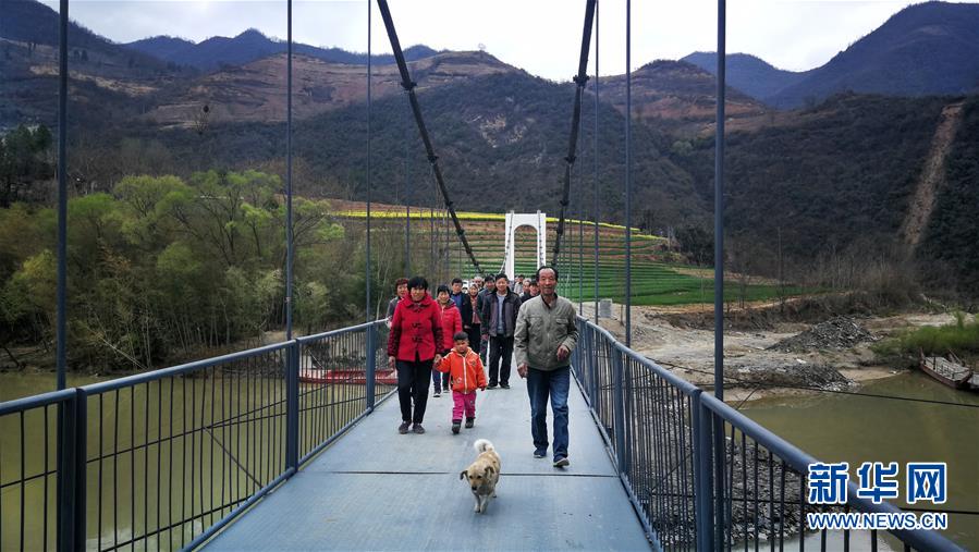 3月25日,略陽縣徐家坪鎮(zhèn)藥木院村村民走在新修的鋼結(jié)構(gòu)吊橋上。 新華社記者陶明攝