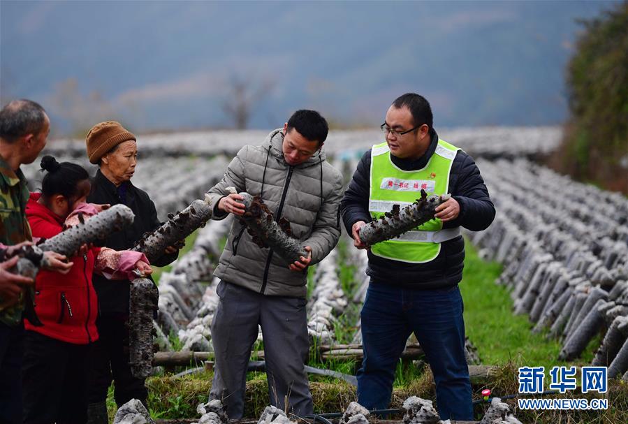 在廣西融水苗族自治縣大浪鎮(zhèn)上里村木耳種植基地,駐村第一書記楊崛(右一)和社員們在查看木耳的生長情況(2月28日攝)。