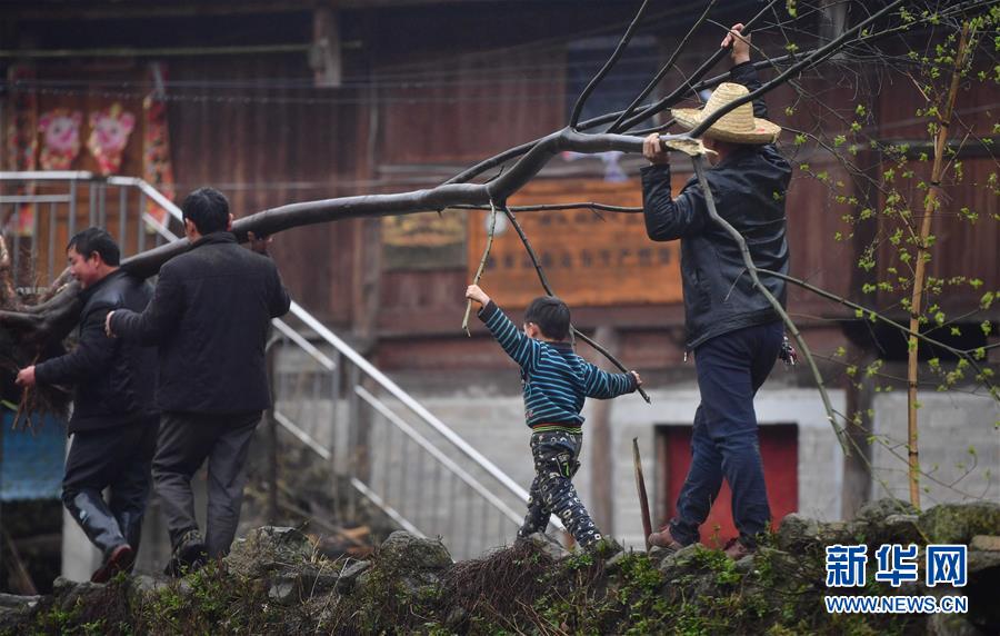 這是黔桂烏英苗寨的群眾在抬樹苗,準(zhǔn)備用來美化居住環(huán)境(3月16日攝)。