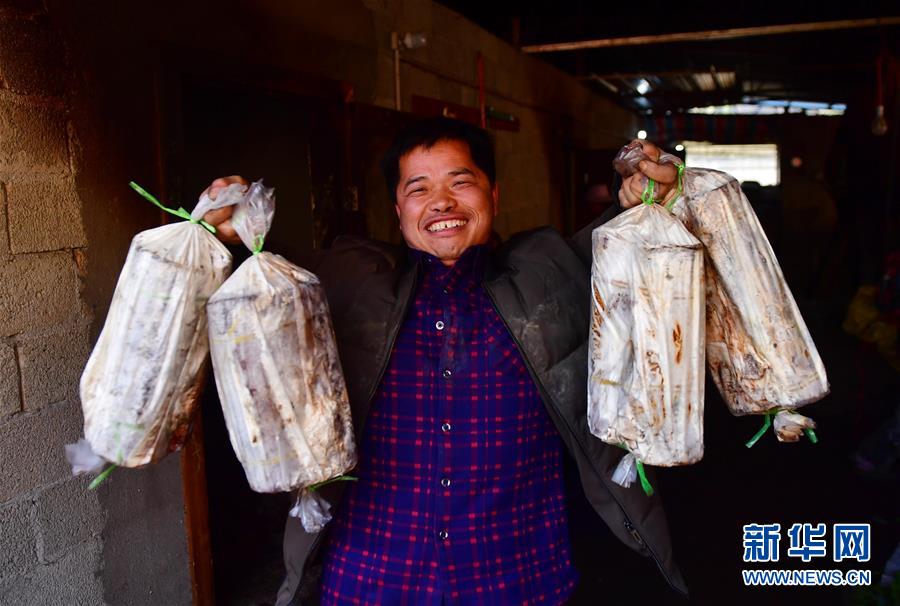 在廣西融水苗族自治縣桿洞鄉(xiāng)堯告村,貧困戶韋玉元在苗坪嶺藥材種植專業(yè)合作社里領(lǐng)取靈芝菌棒(3月11日攝)。