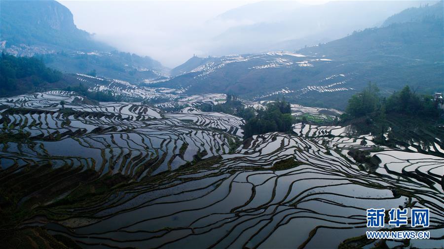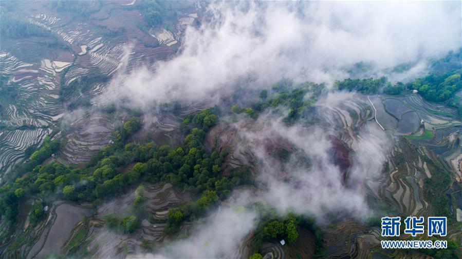 這是在云南省元陽(yáng)縣拍攝的晨曦中的哈尼梯田美景(4月4日無(wú)人機(jī)拍攝)。哈尼梯田位于云南省哀牢山南部,以哈尼族為主的當(dāng)?shù)厝罕娗О倌陙?lái)生生不息在大地上“雕刻”出這一農(nóng)耕文明奇觀。春日里,漫山的水稻梯田與云海、森林、村莊形成一幅美麗的畫(huà)卷,吸引眾多海內(nèi)外游客前來(lái)觀賞。新華社記者 胡超 攝