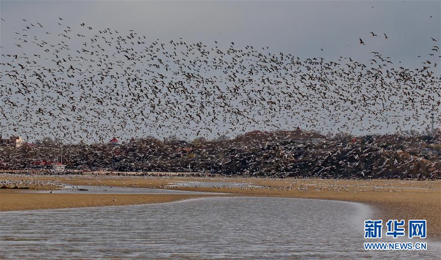 4月4日,一群候鳥在秦皇島市沿海濕地飛翔。近日,大批候鳥飛抵河北省秦皇島市沿海濕地,出現(xiàn)“萬鳥臨?!逼嬗^。秦皇島沿海濕地鳥類食物豐富,每年春、秋兩季,大批候鳥遷徙經(jīng)過這里。新華社記者 楊世堯 攝