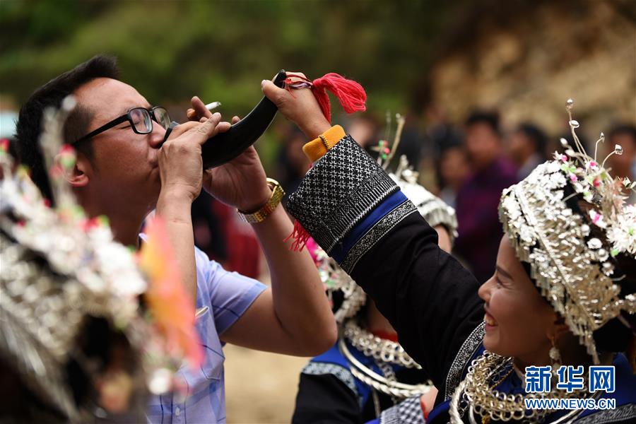 苗族群眾給來賓敬牛角酒(4月6日攝)。4月6日至7日,在貴州省黔東南苗族侗族自治州劍河縣觀么鎮(zhèn)新民村和新合村,來自劍河縣和三穗縣的苗族同胞歡聚一堂,通過民族歌舞展演、非遺手工藝展示、千戶祭“巫耶”、跳蘆笙舞等形式,與來賓一起歡慶2019年高雍苗族“三月三”民俗文化節(jié)。 新華社記者 楊文斌 攝