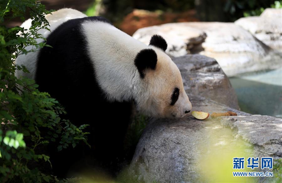 4月6日,在美國圣迭戈動物園熊貓館,大熊貓“白云”在覓食。新華社記者李穎攝