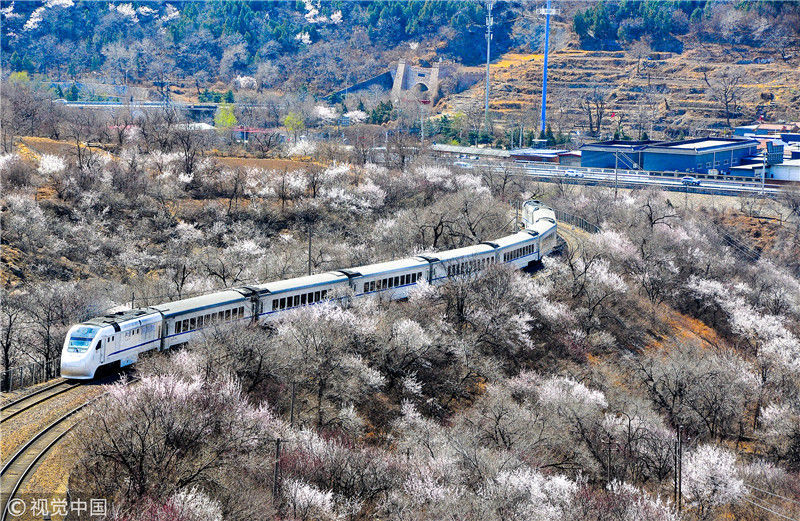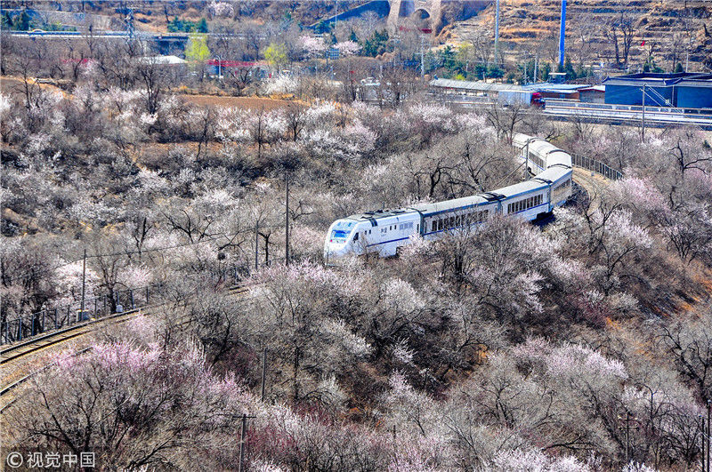 2019年3月22日,北京居庸關(guān)附近的山花盛開,S2線列車穿行在花海之中,構(gòu)成一幅美麗的畫面。時(shí)永平/千龍圖像/視覺中國(guó) 編輯/陳進(jìn)