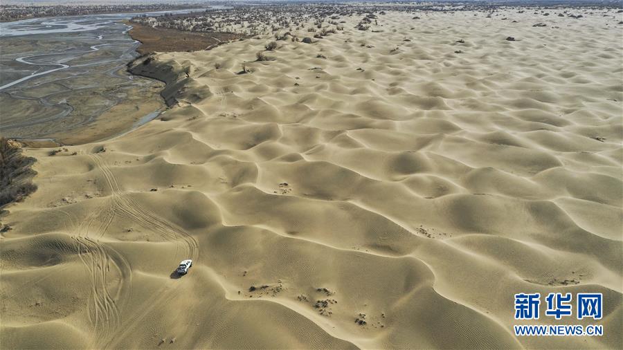 依明乘坐的汽車行駛在塔克拉瑪干沙漠中。從依明家坐車前往于田縣城,全程不足300公里,越野車需行駛7小時(shí)左右(3月19日無人機(jī)拍攝)。