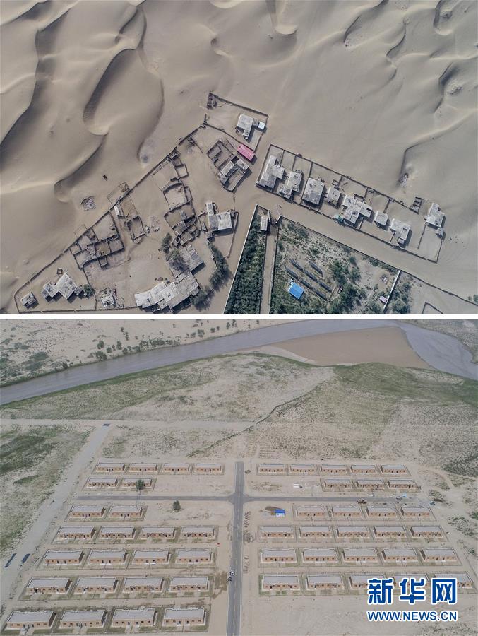 拼版照片:上圖為地處沙漠腹地的新疆于田縣達(dá)里雅布依鄉(xiāng)一處村落(2018年9月6日無(wú)人機(jī)拍攝);下圖為建設(shè)中的達(dá)里雅布依小鎮(zhèn)易地扶貧安置點(diǎn)(2018年9月8日無(wú)人機(jī)拍攝)。新華社記者 胡虎虎 攝