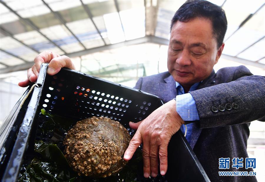 4月18日,連江縣筱埕鎮(zhèn)一家鮑魚養(yǎng)殖育種企業(yè)的技術(shù)人員展示新培育的美國(guó)綠鮑新品種。