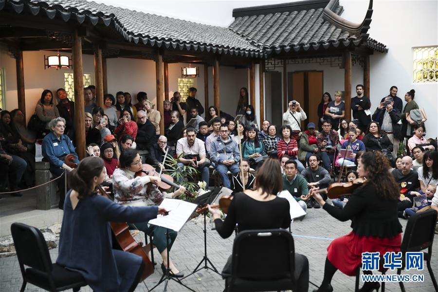 2018年2月24日,人們?cè)诿绹?guó)紐約大都會(huì)博物館“明軒”欣賞演出,慶祝新春佳節(jié)。中式庭院“明軒”是中國(guó)第一個(gè)落戶海外的蘇式園林,位于美國(guó)紐約大都會(huì)博物館二層的玻璃天棚下,是模仿中國(guó)蘇州網(wǎng)師園中的“殿春簃”設(shè)計(jì)建造而成的?!懊鬈帯庇商K州市園林管理局承建,所用的磚、瓦、木材、構(gòu)件等在中國(guó)備好后,由20余名中國(guó)工程師和工匠在美國(guó)組裝。 新華社記者王迎攝