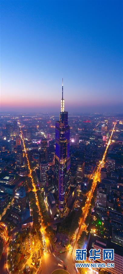 這是4月17日無人機(jī)拍攝的南京紫峰大廈和城市夜景。 新華社記者 李博 攝