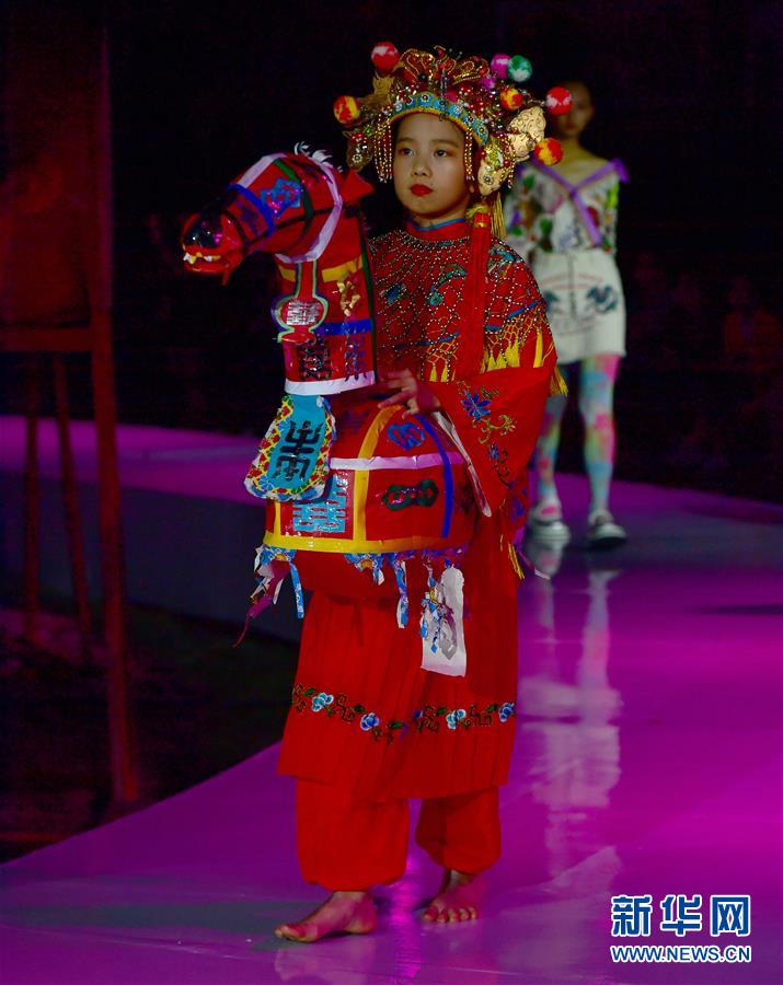 4月27日,小模特身穿民族服飾展示土樓當?shù)氐姆俏镔|(zhì)文化遺產(chǎn)竹馬戲。 當日,土樓光語國際時尚大秀在福建省南靖縣的土樓裕昌樓內(nèi)舉行。這場融匯文化、時尚與旅游元素的大秀,通過傳統(tǒng)與時尚的有機融合,展現(xiàn)南靖土樓及文化的魅力和風(fēng)采。 新華社記者魏培全攝