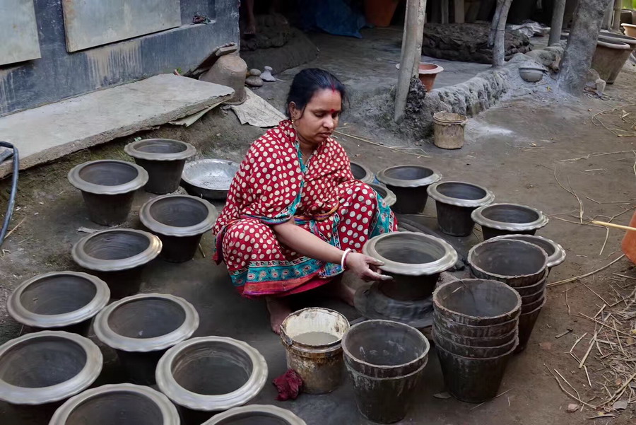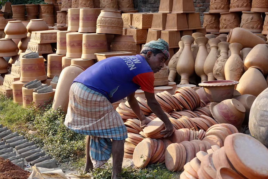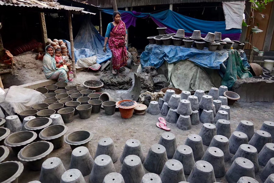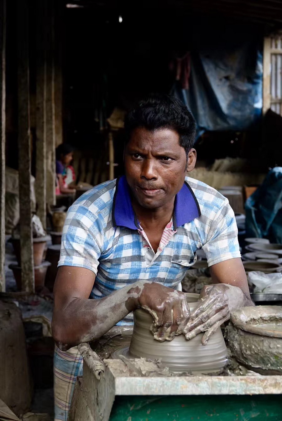 達(dá)卡遠(yuǎn)郊區(qū)一個印度教徒聚居的村莊,幾乎家家戶戶都開辦制陶作坊,以傳統(tǒng)工藝制作陶盆、陶罐、陶盤和建筑裝飾陶器,遠(yuǎn)銷孟加拉國內(nèi)各地。李仁奇 攝