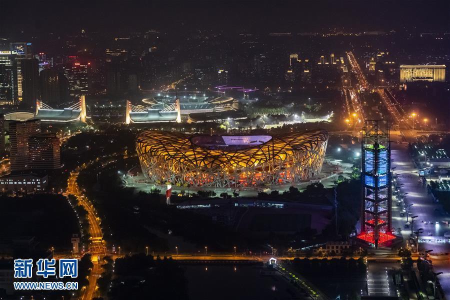“鳥巢”燈光璀璨(5月14日攝)。 當晚,一場“空間光影秀”在北京上演。 新華社記者 沈伯韓 攝