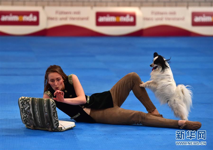 5月19日,在德國多特蒙德舉行的寵物展上,一名女士帶著愛犬參加寵物跳舞比賽。 為期三天的德國多特蒙德“狗和貓”寵物展19日落幕。寵物展期間,人們帶著自己的“萌寵”來到會場,參與寵物跳水、舞蹈、選美等趣味比賽,并與其他寵物愛好者及展商交流互動(dòng)。 新華社記者逯陽攝