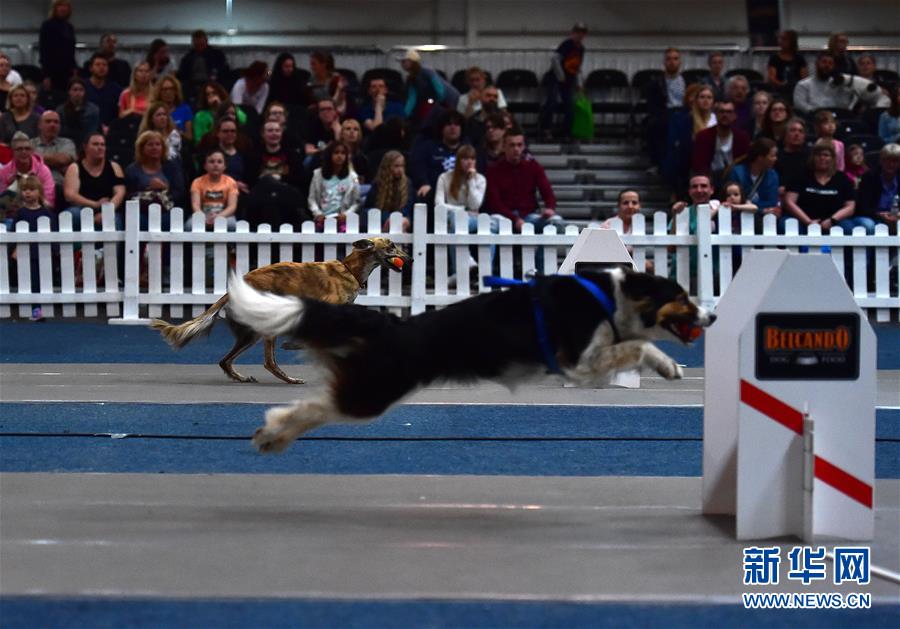 5月19日,在德國多特蒙德舉行的寵物展上,兩只狗狗參加速度競賽。 為期三天的德國多特蒙德“狗和貓”寵物展19日落幕。寵物展期間,人們帶著自己的“萌寵”來到會場,參與寵物跳水、舞蹈、選美等趣味比賽,并與其他寵物愛好者及展商交流互動(dòng)。 新華社記者逯陽攝