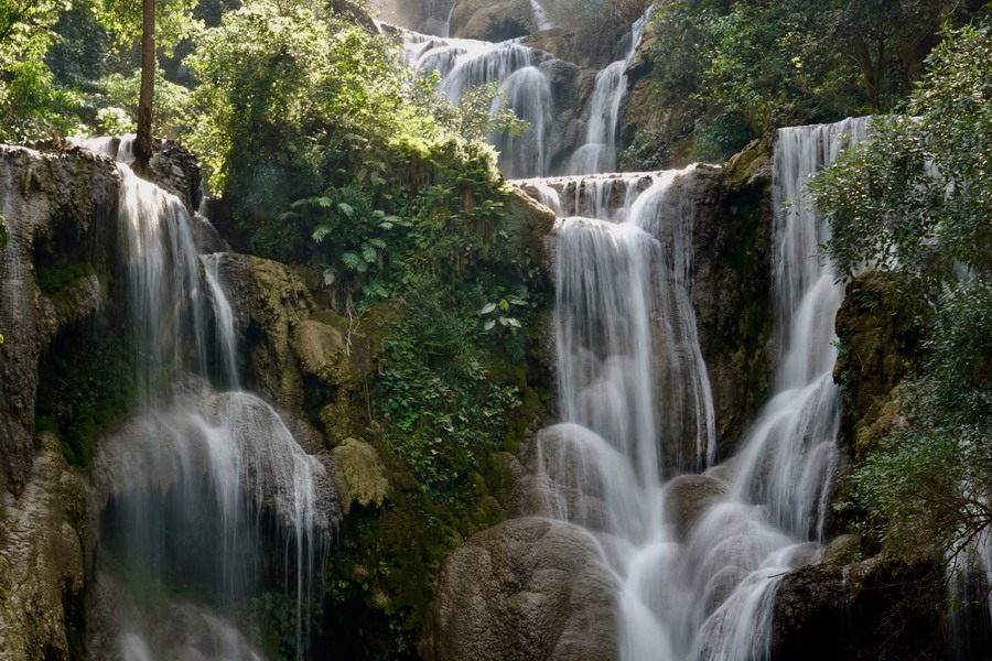 光西瀑布是一個瀑布群,位于瑯勃拉邦以南30多公里的原始森林中,其中一處高40多米,雖然水量不大,但有一種天然的涓細之美,不同凡響。