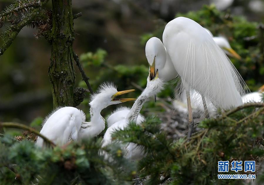 在江西省南昌市新建區(qū)象山森林公園內(nèi),白鷺和自己的雛鳥(niǎo)在一起(5月21日攝)。 近日,在江西省南昌市新建區(qū)象山森林公園內(nèi),已安家筑巢的大批鷺鳥(niǎo)陸續(xù)孵化出了后代。象山森林公園有著“鷺鳥(niǎo)王國(guó)”的美譽(yù),生態(tài)環(huán)境良好,每年都會(huì)吸引白鷺、蒼鷺、夜鷺等種類(lèi)的鷺鳥(niǎo)飛抵棲息和繁衍后代。 新華社記者 彭昭之 攝