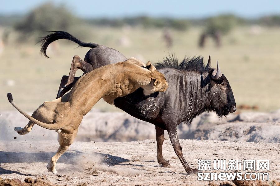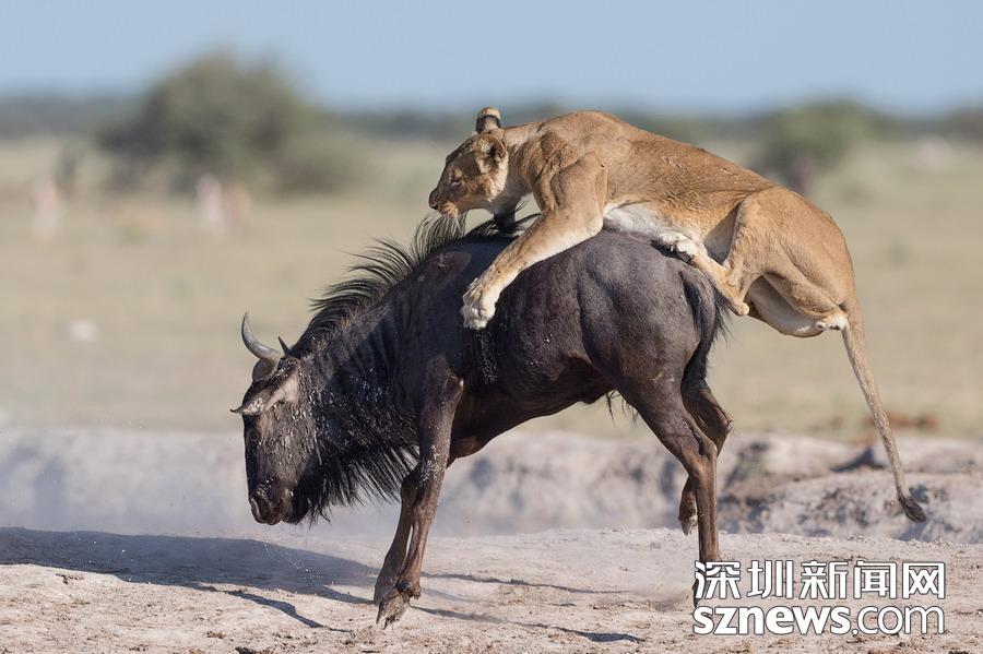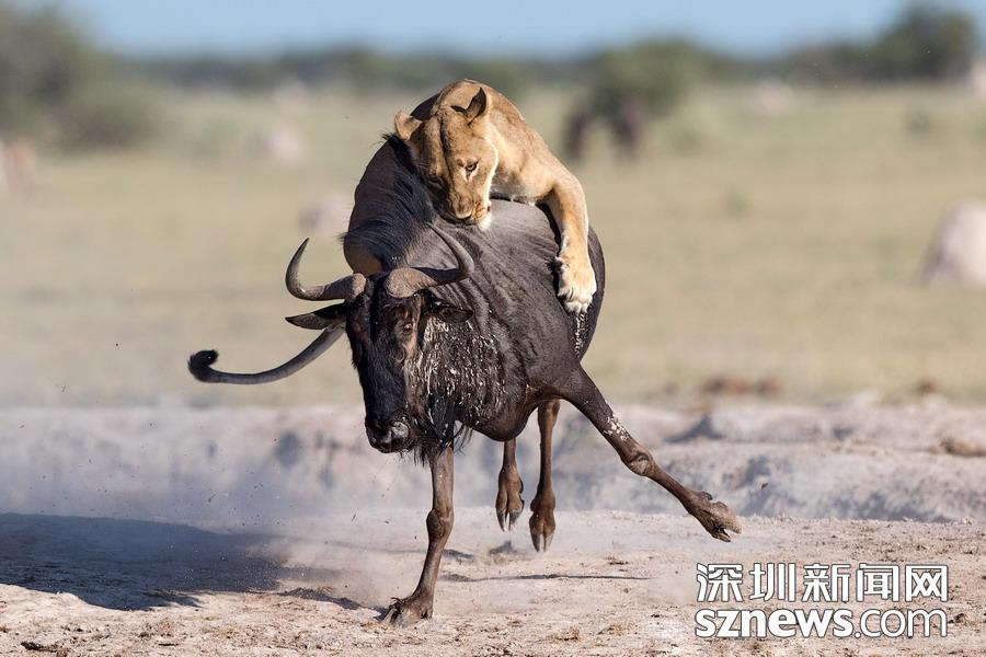 英國攝影師蘇-莫里斯(Sue Morri)在博茨瓦納Nxai Pan國家公園游玩,目睹了一場兇惡母獅獵食角馬的畫面。母獅甚至攀到了角馬背上,想要牢牢遏制住到手的“美餐”。強壯的角馬努力地與母獅抗爭,竭力想要保住自己的性命,但最終還是不敵母獅被拿下,最后成了母獅孩子們的盤中餐。