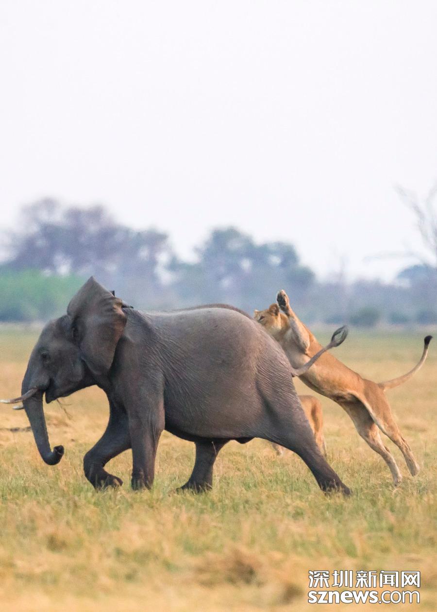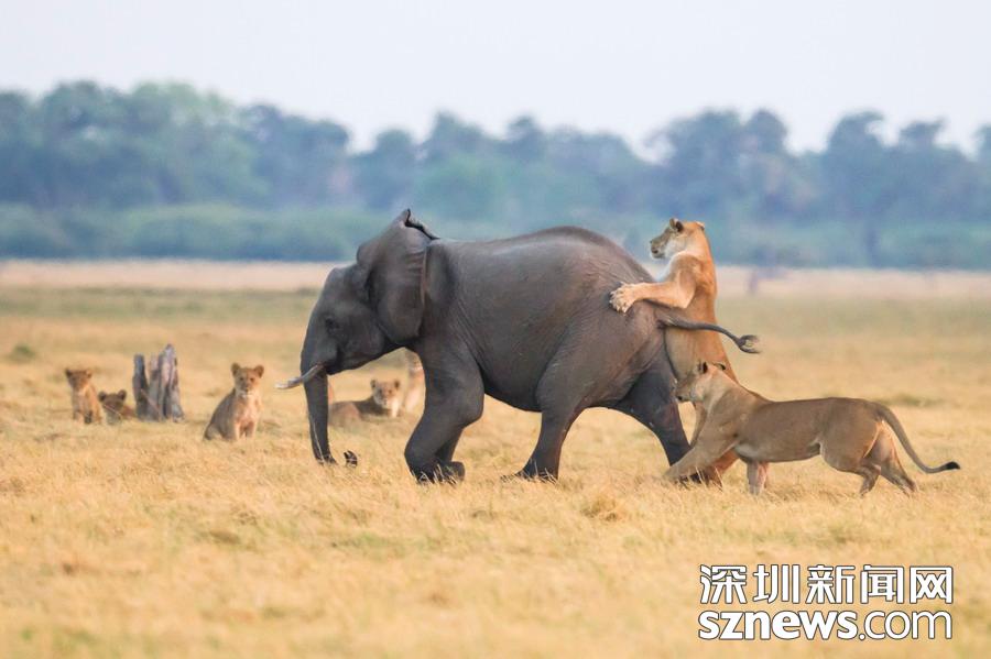 英國攝影師詹姆斯(James Gifford)在博茨瓦納喬貝國家公園拍到一群獅子獵食大象的精彩畫面。在詹姆斯的鏡頭下,一頭母獅跳到了一頭小象的背上想要將其拿下,但僅憑一己之力又不能做到。但當母獅的后援抵達時,象群也趕到了現(xiàn)場。最終,小象回到了象群中獲得庇護,而獅群也不得不悻悻離去。