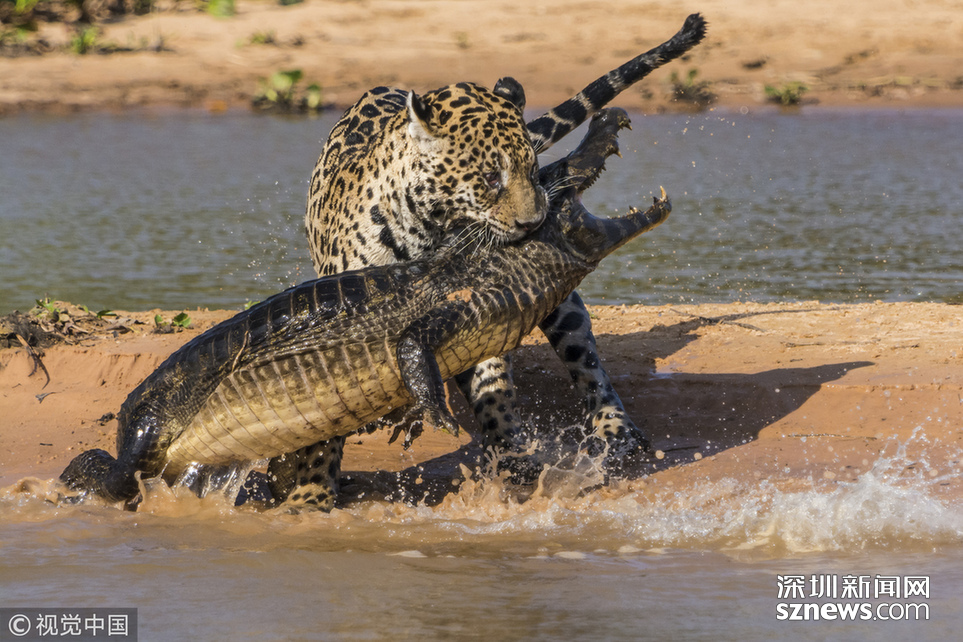 當?shù)貢r間2013年8月25日,巴西潘特納爾,一頭雄性美洲豹攻擊了一條巴拉圭凱門鱷并與之纏斗。這只美洲豹預先躲在水中匍匐前進,然后突然出現(xiàn)把這只鱷魚震住,隨后用牙刺進鱷魚的堅硬的外殼中,將其拖入?yún)擦帧?/p>