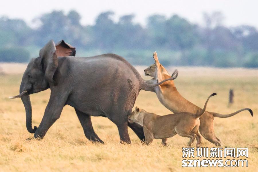 英國攝影師詹姆斯(James Gifford)在博茨瓦納喬貝國家公園拍到一群獅子獵食大象的精彩畫面。在詹姆斯的鏡頭下,一頭母獅跳到了一頭小象的背上想要將其拿下,但僅憑一己之力又不能做到。但當(dāng)母獅的后援抵達(dá)時(shí),象群也趕到了現(xiàn)場。最終,小象回到了象群中獲得庇護(hù),而獅群也不得不悻悻離去。