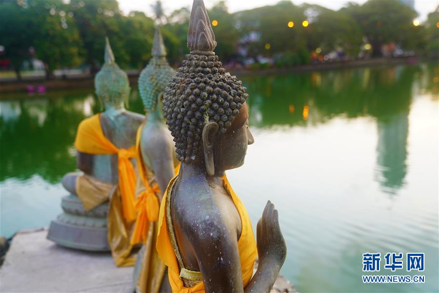 這是夕陽下的斯里蘭卡科倫坡水中廟佛像(5月27日攝)。 在科倫坡貝拉湖上有一座木造樓閣——水中廟。木造建筑上面覆蓋著藍(lán)瓦,外圍環(huán)繞著線條優(yōu)美的佛像。樓閣外高臺(tái)上供奉的佛像,與不遠(yuǎn)處的高層建筑相互映照。祥和寧靜的水中廟已成為人們修心、祈福的重要場(chǎng)所。 新華社記者唐璐攝