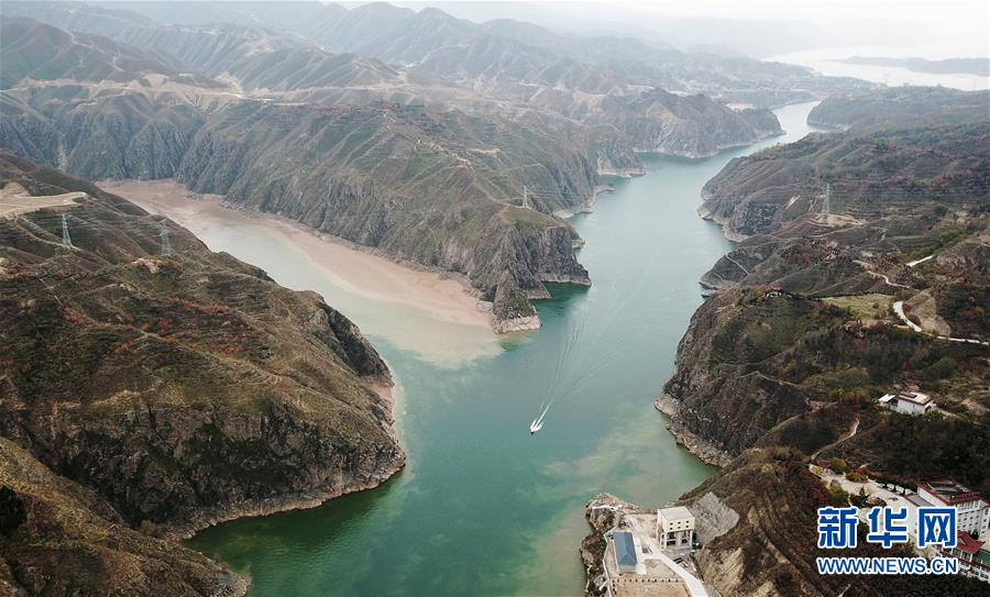 10月24日,一艘快艇從劉家峽水庫(kù)庫(kù)區(qū)的洮河與黃河交匯處駛過(無(wú)人機(jī)拍攝)。 新華社記者 陳斌 攝