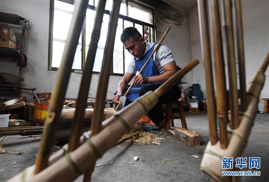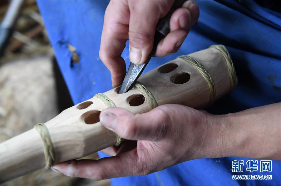 5月30日,在融水苗族自治縣安太鄉(xiāng)小桑村青山屯,杜信文在制作蘆笙。 新華社記者 陸波岸 攝