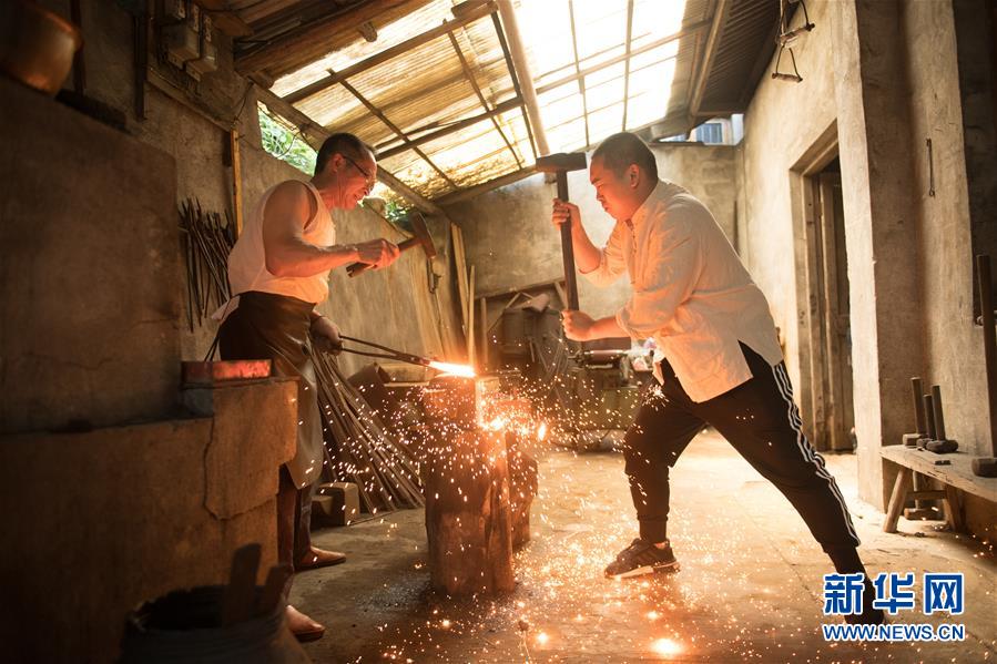 5月21日,鄭國(guó)榮的徒弟們?cè)凇肮旁絼︿仭睂W(xué)習(xí)寶劍鍛打技藝。 新華社記者 翁忻旸 攝