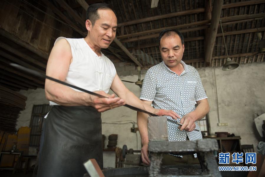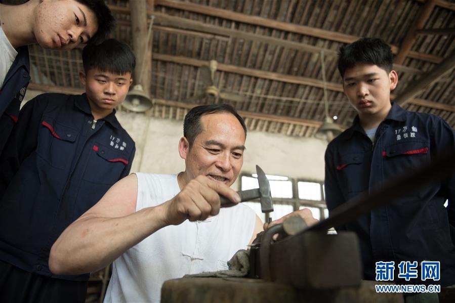 5月21日,鄭國(guó)榮在“古越劍鋪”向徒弟們傳授寶劍淬火技藝。 新華社記者 翁忻旸 攝