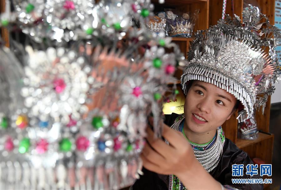 5月29日,在廣西融水苗族自治縣融水鎮(zhèn),一名女青年在挑選苗族頭飾。