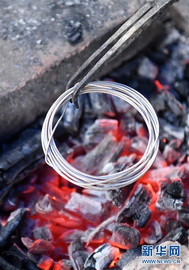5月29日,在廣西融水苗族自治縣融水鎮(zhèn),銀匠陳四先在煅燒一條銀絲準(zhǔn)備飾物。