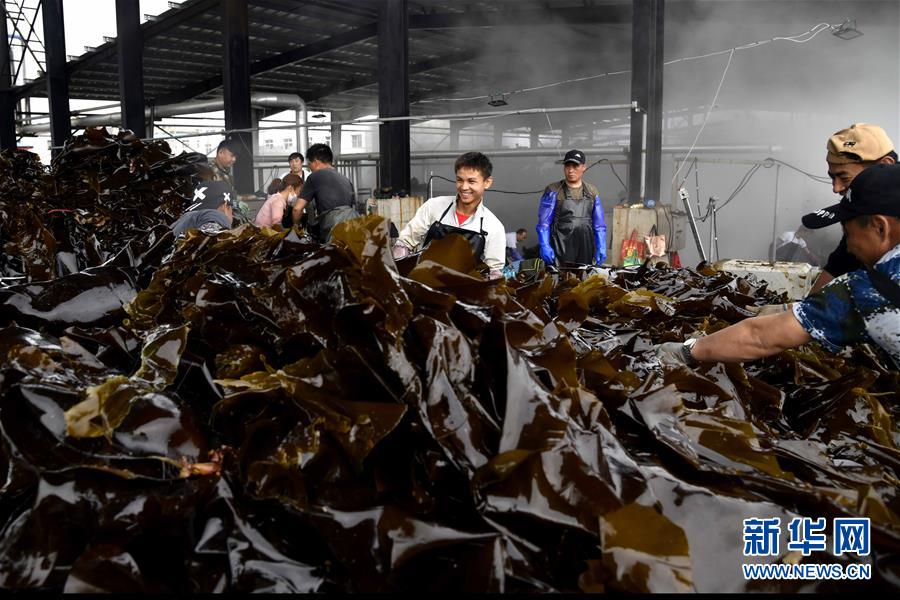6月5日,在榮成市尋山街道青魚(yú)灘村,漁民在收獲海帶。 近日,山東省榮成市迎來(lái)海帶收獲季。據(jù)悉,榮成市海帶養(yǎng)殖面積14.5萬(wàn)畝,年產(chǎn)海帶43.3萬(wàn)噸以上。 新華社記者郭緒雷攝