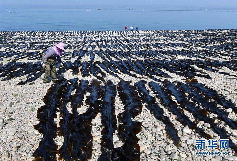 海島居民在大欽島鄉(xiāng)東村的海灘上晾曬海帶(5月23日攝)。 新華社記者 朱崢 攝