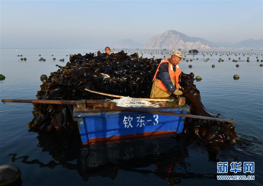 海島居民們在養(yǎng)殖區(qū)收割海帶(5月24日攝)。 新華社記者 朱崢 攝