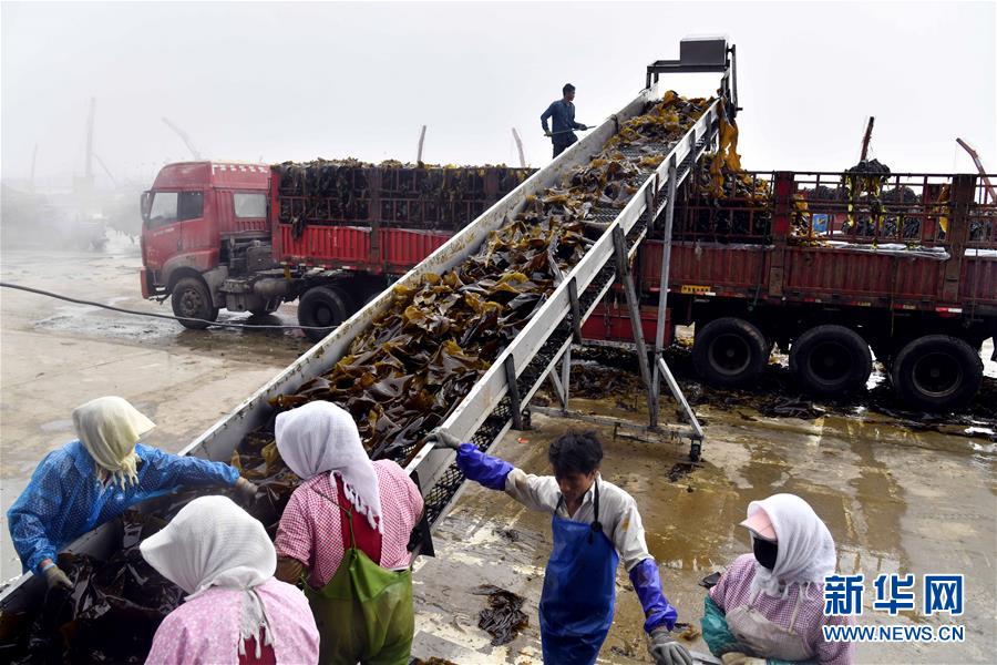6月5日,在榮成市尋山街道青魚灘村,漁民在收獲海帶。 近日,山東省榮成市迎來(lái)海帶收獲季。據(jù)悉,榮成市海帶養(yǎng)殖面積14.5萬(wàn)畝,年產(chǎn)海帶43.3萬(wàn)噸以上。 新華社記者郭緒雷攝