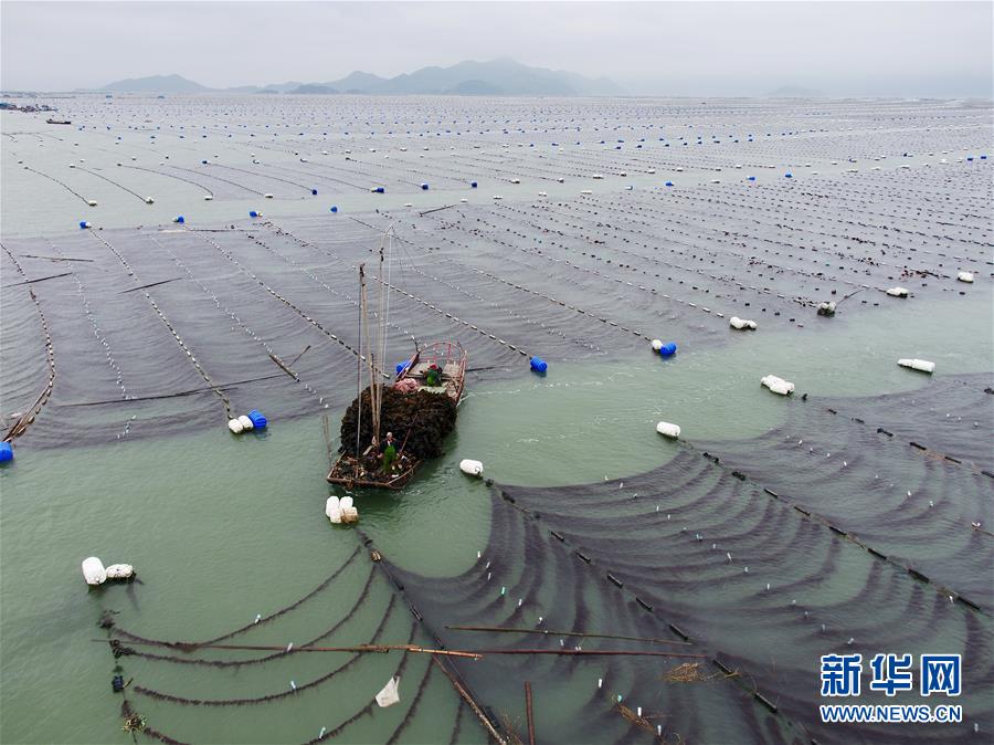 4月10日,霞浦縣長春鎮(zhèn)海域,海帶養(yǎng)殖戶在用船只運(yùn)輸海帶(無人機(jī)拍攝)。近日,福建省寧德市霞浦縣30余萬畝養(yǎng)殖海帶進(jìn)入收獲季節(jié),當(dāng)?shù)仞B(yǎng)殖戶搶抓晴好天氣,收獲海帶。海帶養(yǎng)殖是霞浦縣群眾增收致富的支柱產(chǎn)業(yè)。2018年該縣海帶產(chǎn)量14萬余噸。新華社記者 姜克紅 攝