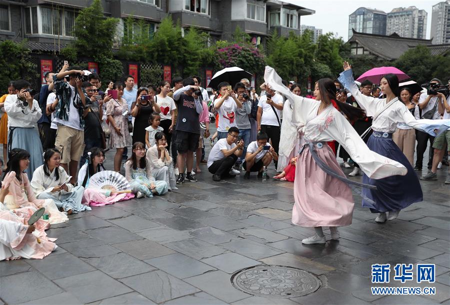 6月9日,在成都寬窄巷子,漢服愛好者表演舞蹈。
