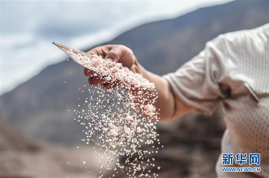 西藏芒康縣納西民族鄉(xiāng)加達(dá)村一名村民在收集鹽田曬的鹽(6月4日攝)。新華社記者晉美多吉攝