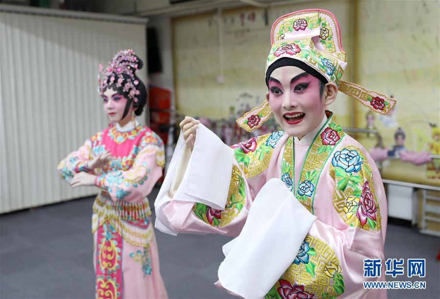 陸瑞徽(左)和利文喆在表演折子戲《艷曲醉周郎》(6月8日攝)。 聲輝粵劇推廣協(xié)會(huì)成立于2003年,是香港重要粵劇藝術(shù)團(tuán)體之一,致力于向青少年推廣粵劇。協(xié)會(huì)目前有兩個(gè)初班,3個(gè)中班,一個(gè)青少年班。粵劇又稱“廣東大戲”,表演技藝包括“唱做念打”,即唱功、身段、臺(tái)詞、武打,主要流行于廣東、廣西和香港、澳門等地區(qū)。2009年,粵劇被列入聯(lián)合國教科文組織人類非物質(zhì)文化遺產(chǎn)代表作名錄,今年正逢十周年。 新華社記者 吳曉初 攝
