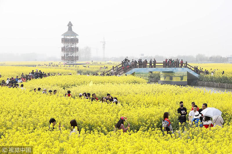 2019年4月7日,江蘇省興化市千垛菜花景區(qū)迎來旅游高峰期,數(shù)萬游客前來欣賞盛開的油菜花,樂享假日好時(shí)光。