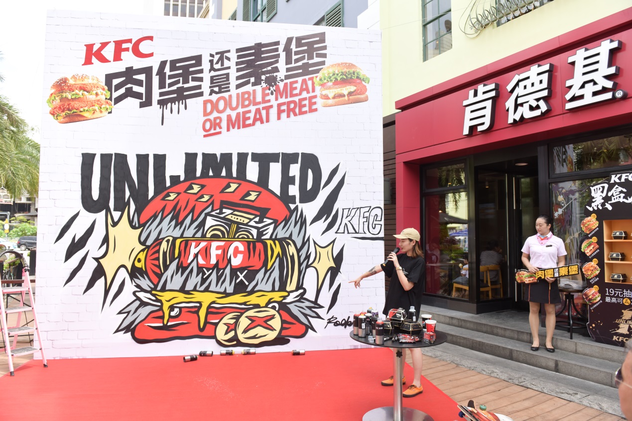 “肯德基是我非常喜歡的品牌,新潮、時(shí)尚。這一次與KFC的涂鴉合作,我在漢堡涂鴉的畫(huà)面中融入了像滑板、打碟機(jī)這樣的潮流元素,來(lái)演繹KFC厚菇堡這一款極具創(chuàng)新性的漢堡。用噴漆罐表現(xiàn)一整塊芝士厚菇,一口咬下能?chē)姵鰸庥舻闹ナ?;火焰燃燒的造型代表漢堡中肆意的醬汁,增加視覺(jué)沖擊感,呈現(xiàn)出一個(gè)沒(méi)有肉,但很real的霸氣素漢堡。”談及創(chuàng)作理念,ROCKLEE說(shuō)道,“這種結(jié)合我覺(jué)得很有意義,一方面展現(xiàn)了涂鴉這種街頭文化多元的一面,另一方面也傳遞出KFC在漢堡界young OG的全新形象?!睆膭?chuàng)作到完工,整個(gè)過(guò)程都引來(lái)路人圍觀、拍照。從朋友圈看到消息的潮人又不斷向此聚集、花式打卡。