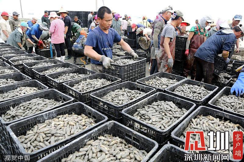 2019年7月9日,漁民們在江蘇連云港沿海地區(qū)海邊的灘涂上將剛收獲的海蟶運送上岸裝箱外運。