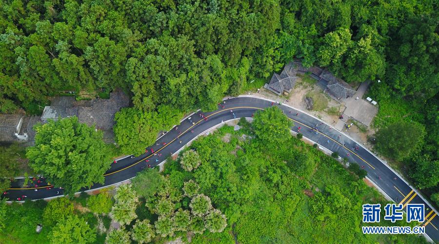 參加首屆丹霞山半程馬拉松的選手們在林間穿梭(2018年5月27日無人機拍攝)。 新華社記者 鄧華 攝