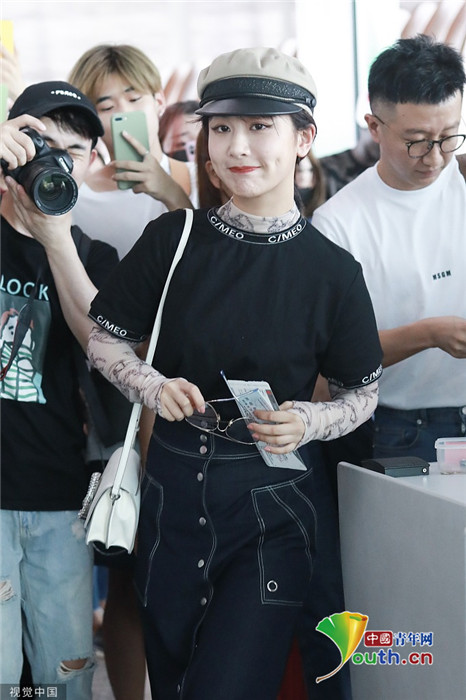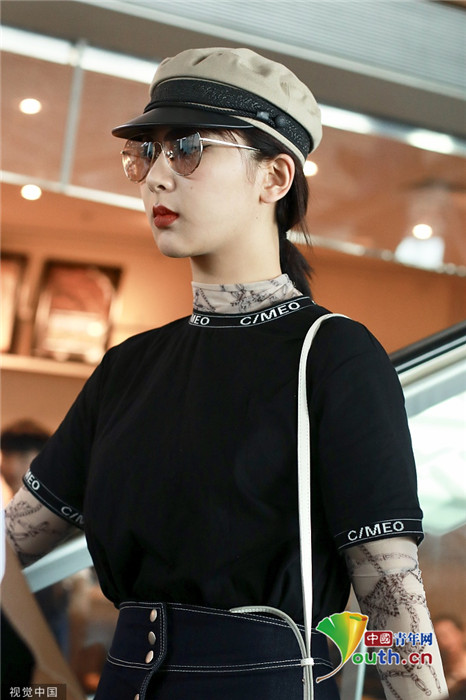 2019年7月25日,北京,楊紫現(xiàn)身機(jī)場。她穿黑色短T配牛仔裙變時髦女郎,戴報(bào)童帽架墨鏡”港風(fēng)女sir“即視感,人氣爆棚。