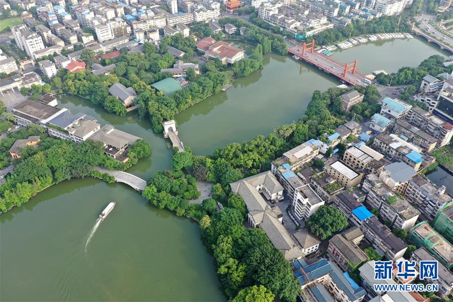 桂林市榕湖附近景觀(7月1日無人機(jī)拍攝)。 夏日時節(jié),廣西桂林市區(qū)內(nèi)的榕湖、杉湖、桂湖、木龍湖等地綠樹成蔭、景色迷人。 新華社記者陸波岸攝