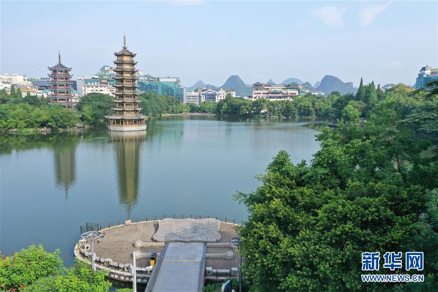 桂林市杉湖景觀(guān)(7月1日無(wú)人機(jī)拍攝)。 夏日時(shí)節(jié),廣西桂林市區(qū)內(nèi)的榕湖、杉湖、桂湖、木龍湖等地綠樹(shù)成蔭、景色迷人。 新華社記者陸波岸攝