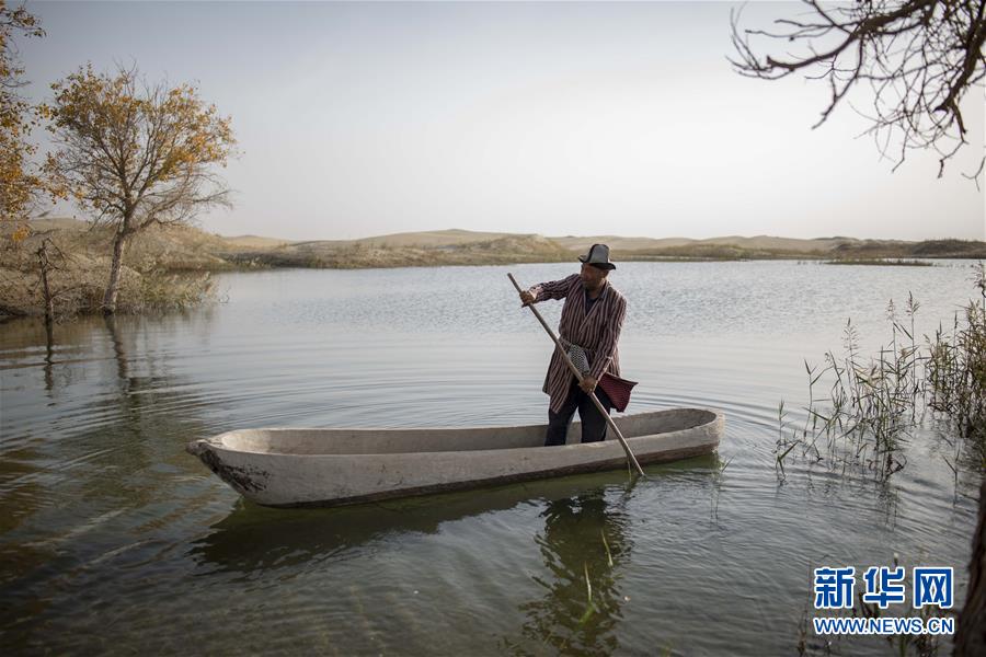 在羅布人村寨,阿木東·艾不東劃著卡盆準(zhǔn)備去捕魚(2018年10月16日攝)。新華社記者 趙戈 攝