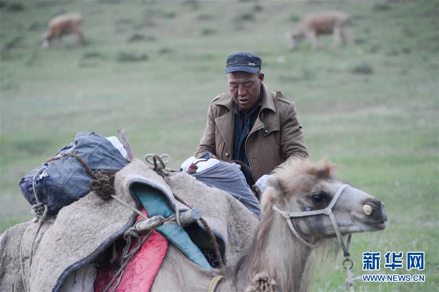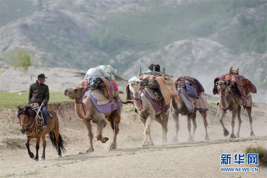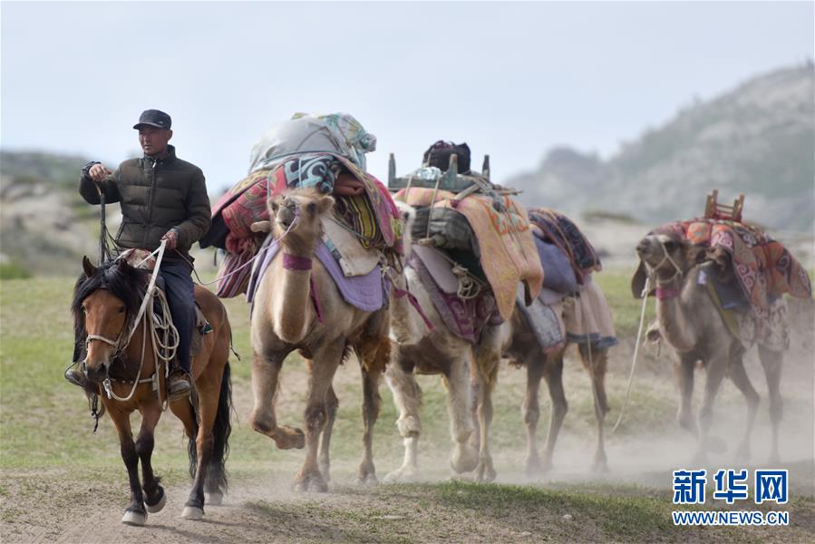 6月6日,新疆阿勒泰地區(qū)福海縣牧民帶著駝隊(duì)行進(jìn)在轉(zhuǎn)場(chǎng)途中。 新華社記者 丁磊 攝