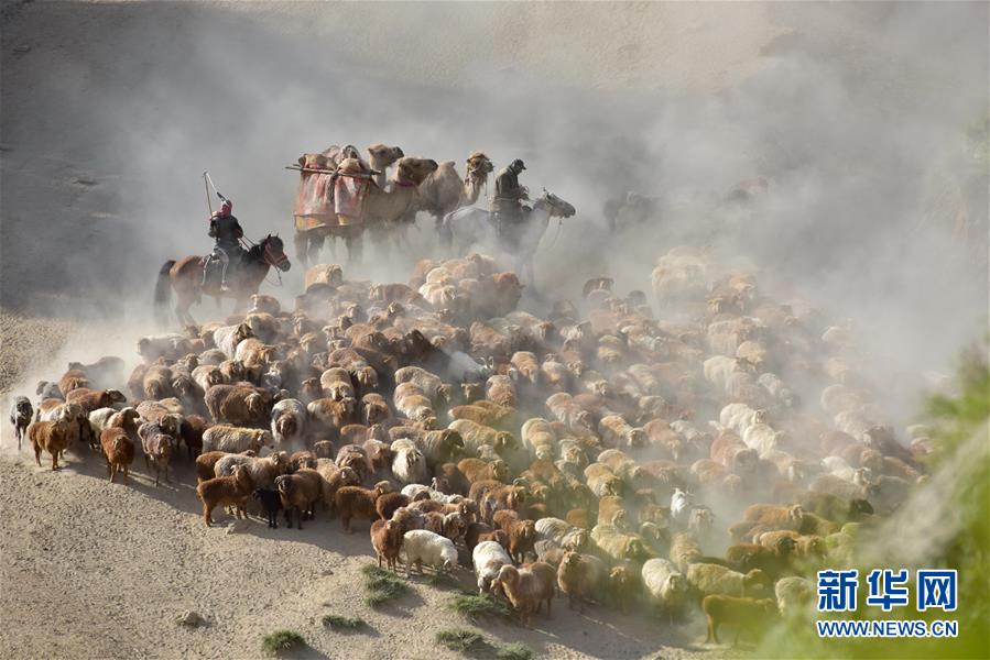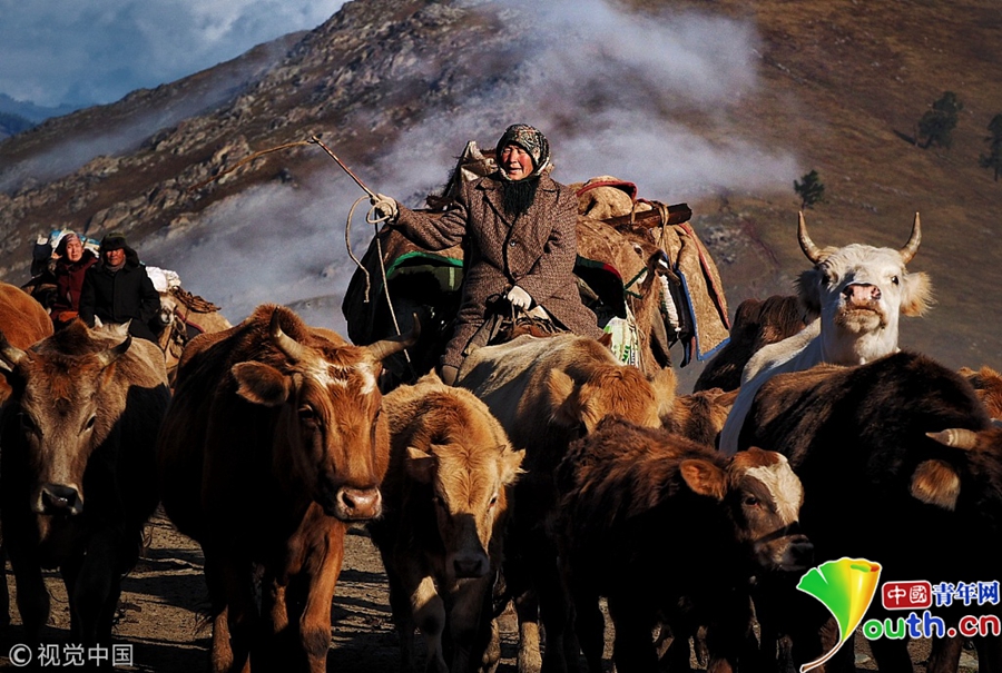 族牧民整理好行裹,抱著孩子,趕著牛羊,浩浩蕩蕩向秋牧場(chǎng)遷徙。